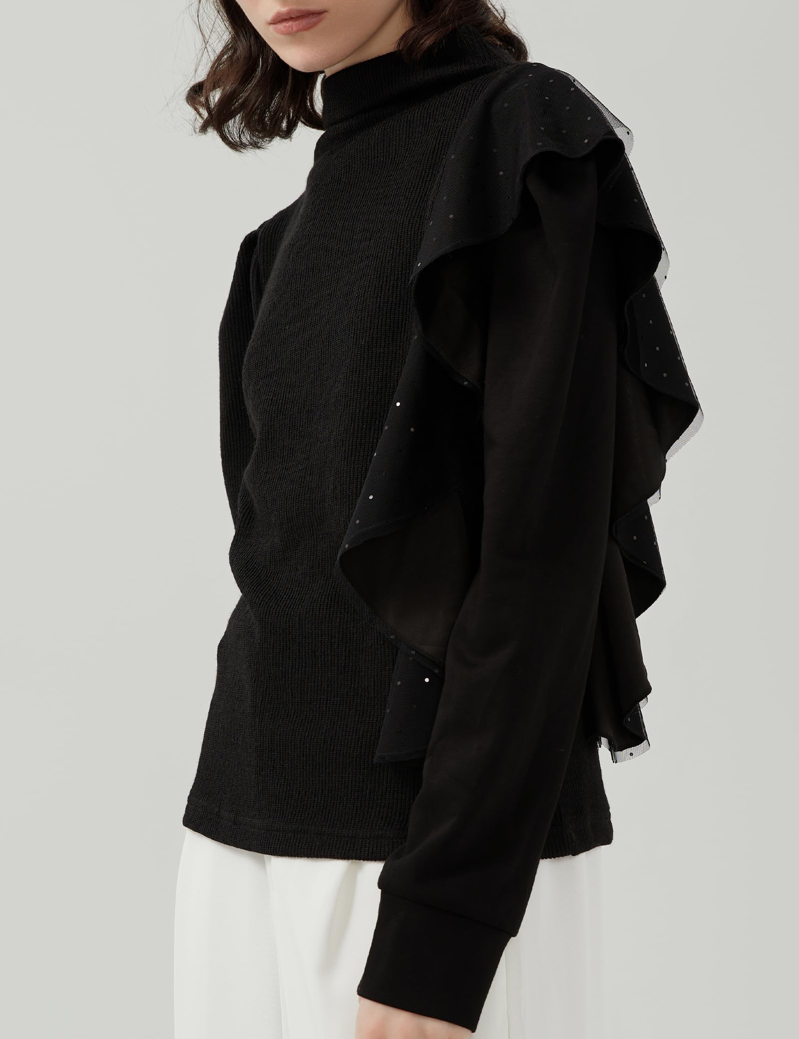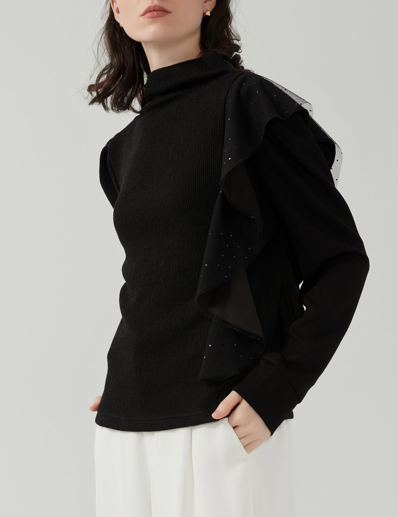 [Unique design] Pullover, turtleneck knitted pullover, mesh patchwork long-sleeved autumn sweater, women’s asymmetrical ruffle knitted sweater, women’s irregular pullover, casual sweater top, long-sleeved pullover, women’s casual knitted shirt, autumn clothing