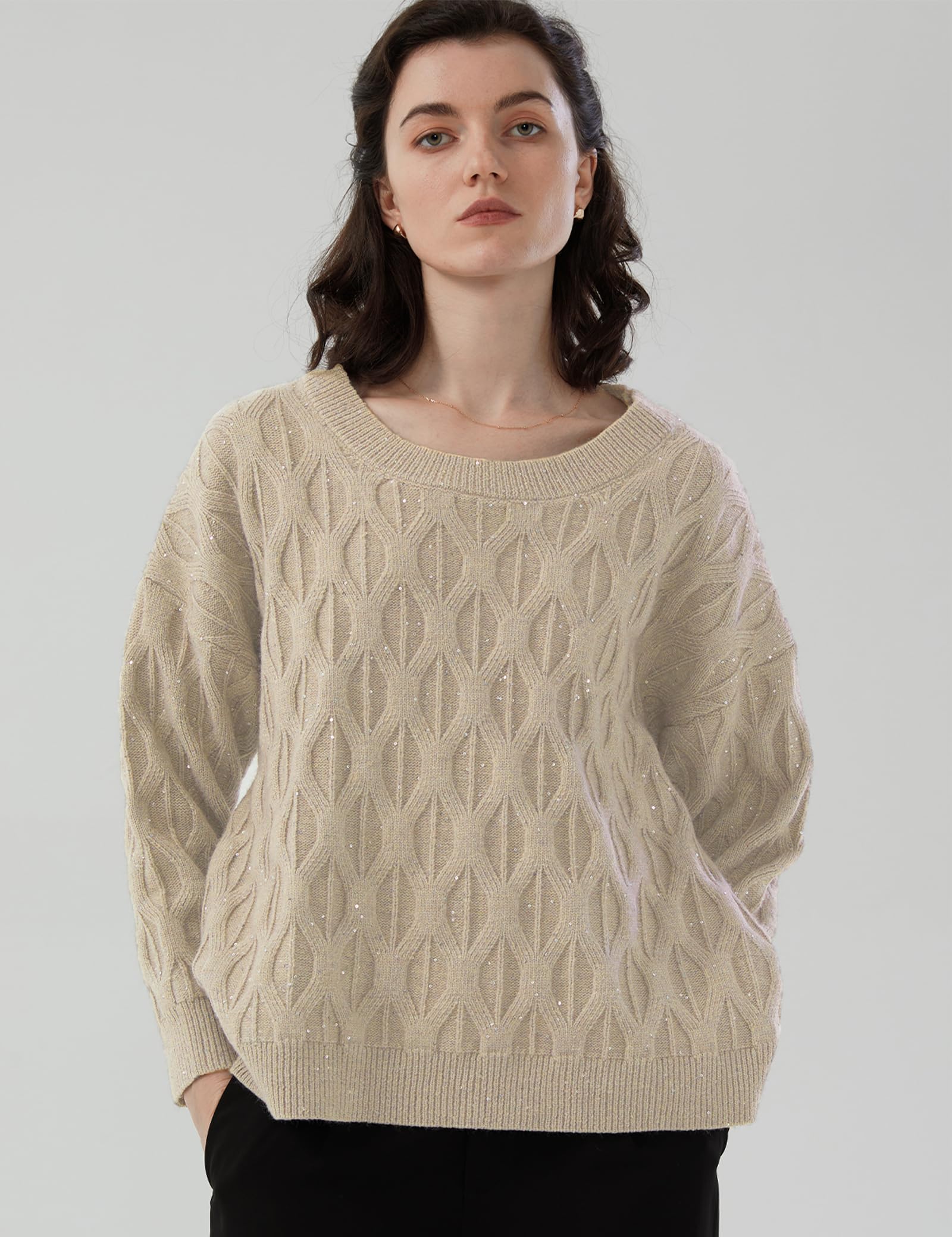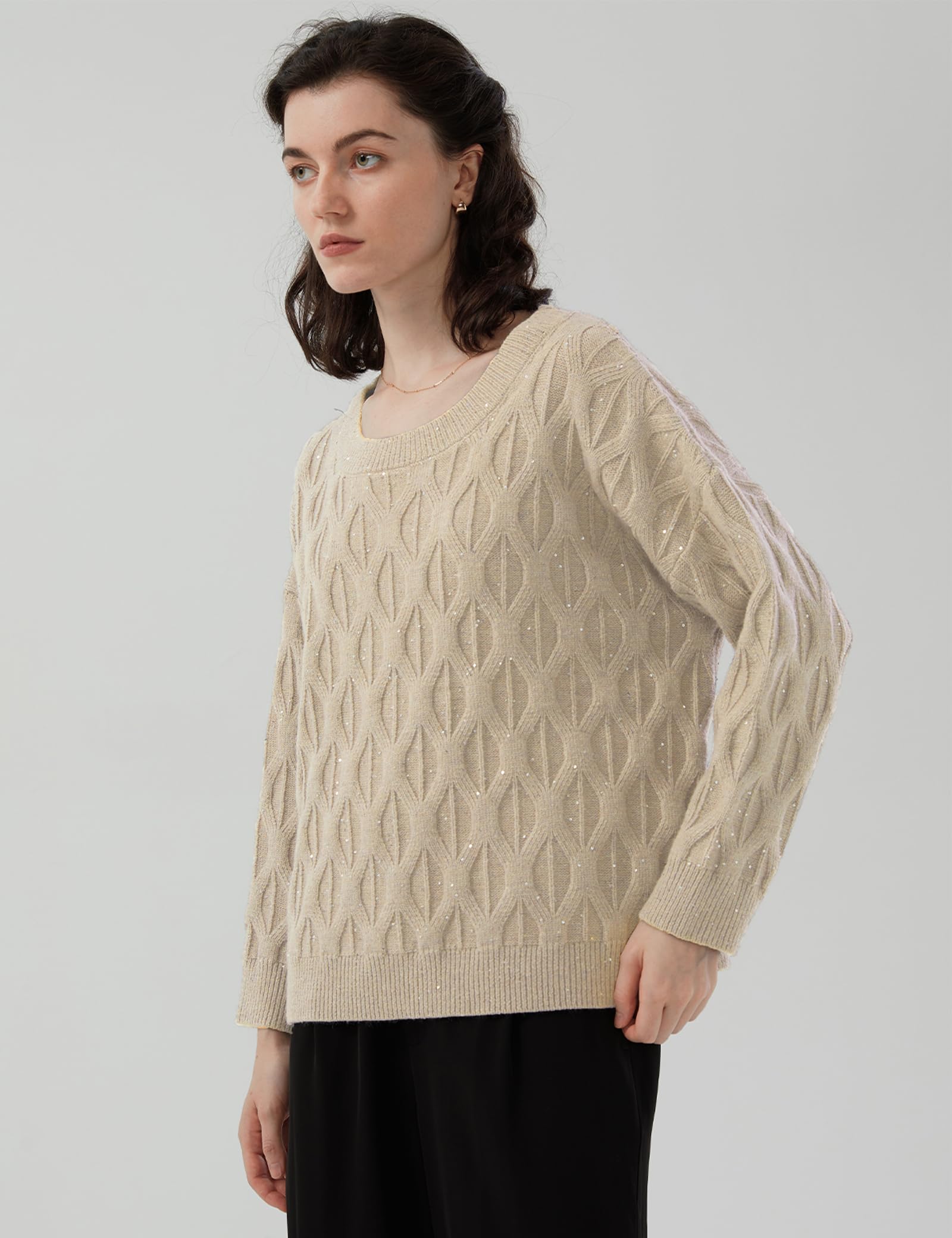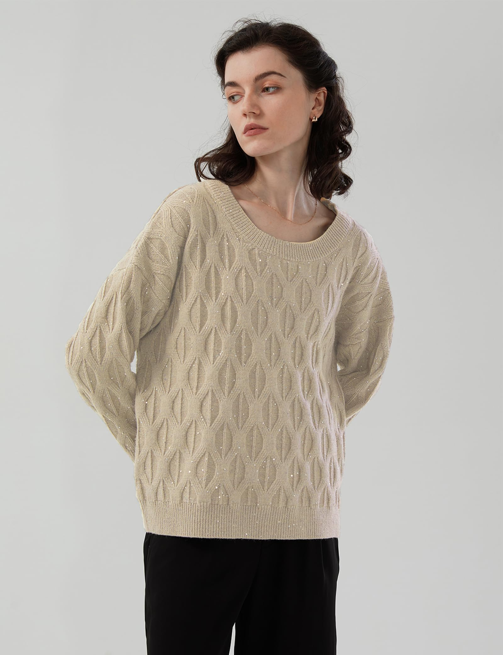 Material: Women’s sequined crew neck sweater, made of 6% wool, 28% polyester, 30% nylon, 36% acrylic, comfortable and warm, exuding relaxed charm